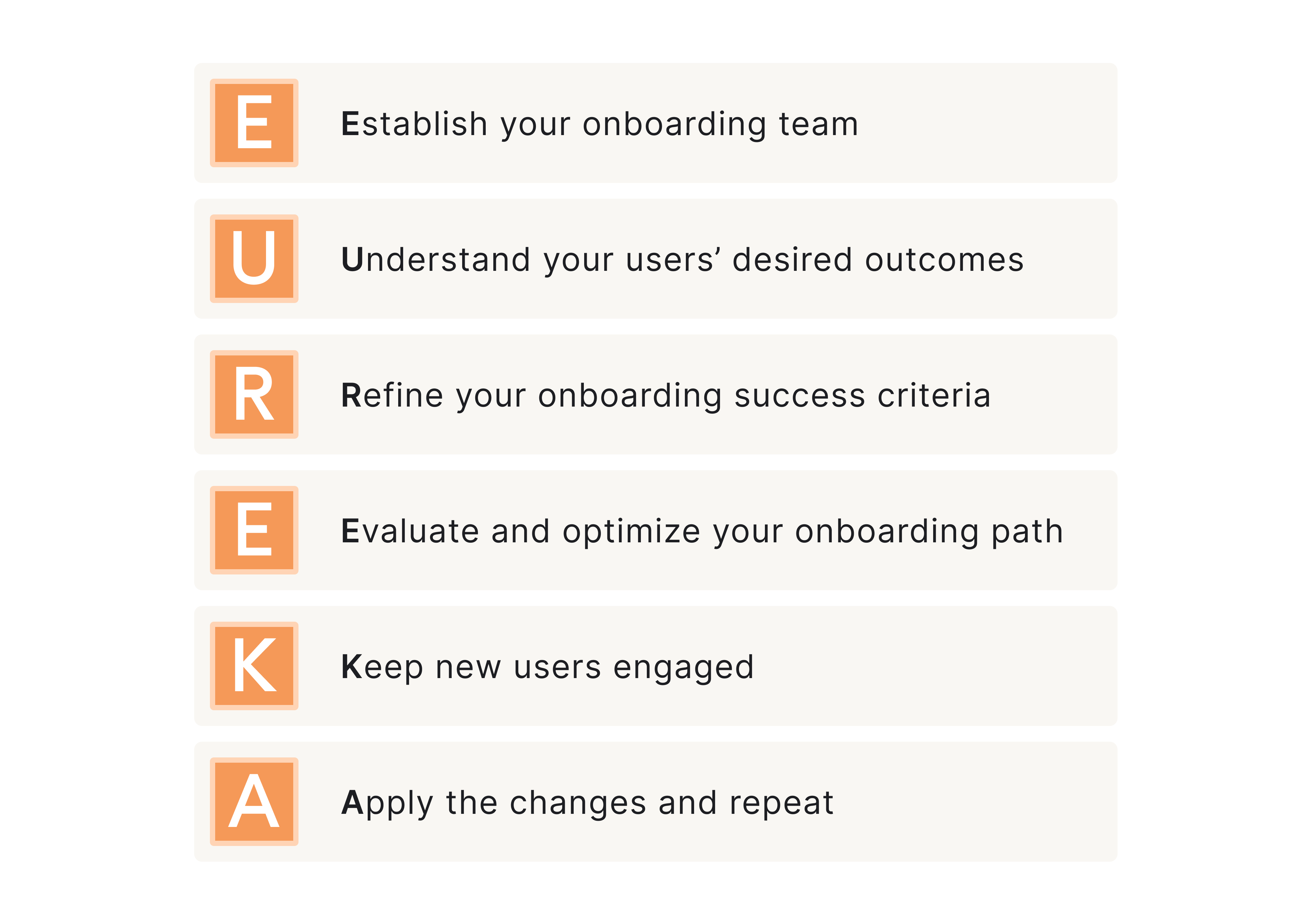The EUREKA framework is a six-step system for how teams should approach the user onboarding process. The ultimate strength of this framework is that it gives structure without locking you into a rigid flow, so it becomes an operational backbone for product-led growth onboarding.
