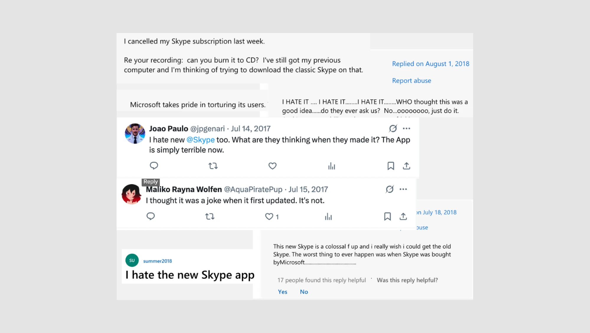 Even Skype’s loyal advocates abandoned the app – one prominent tech commentator said the redesign made Skype “convoluted” and “the performance got terrible,” because “the whole thing lost the ease of use it used to have”.