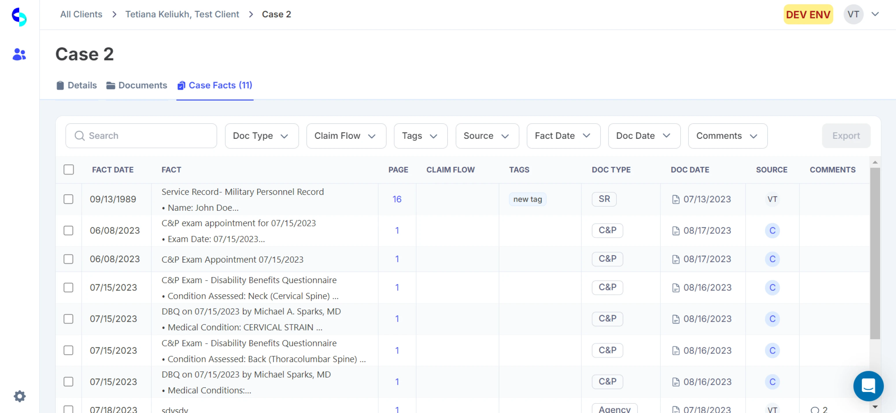 We applied AI-generated tags directly to facts, enabling lawyers to group data by conditions, diagnoses, or timelines. The AI then summarized multiple tagged facts into one short, meaningful overview. For example, instead of filtering through five different entries about “bilateral hearing loss,” a lawyer could click the tag and instantly read a concise summary of the client’s medical history.