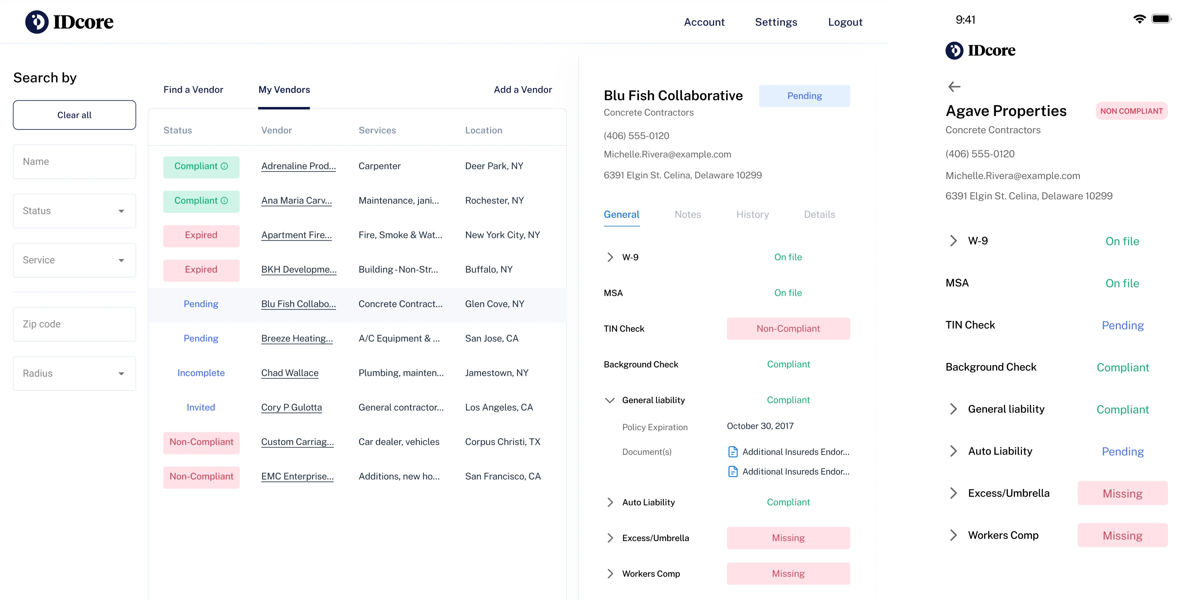 Contractors can use IDCore to store all compliance information in one place. Managers, in turn, can use the app to navigate through the lists of compliant vendors to hire and invite new ones to add their info.