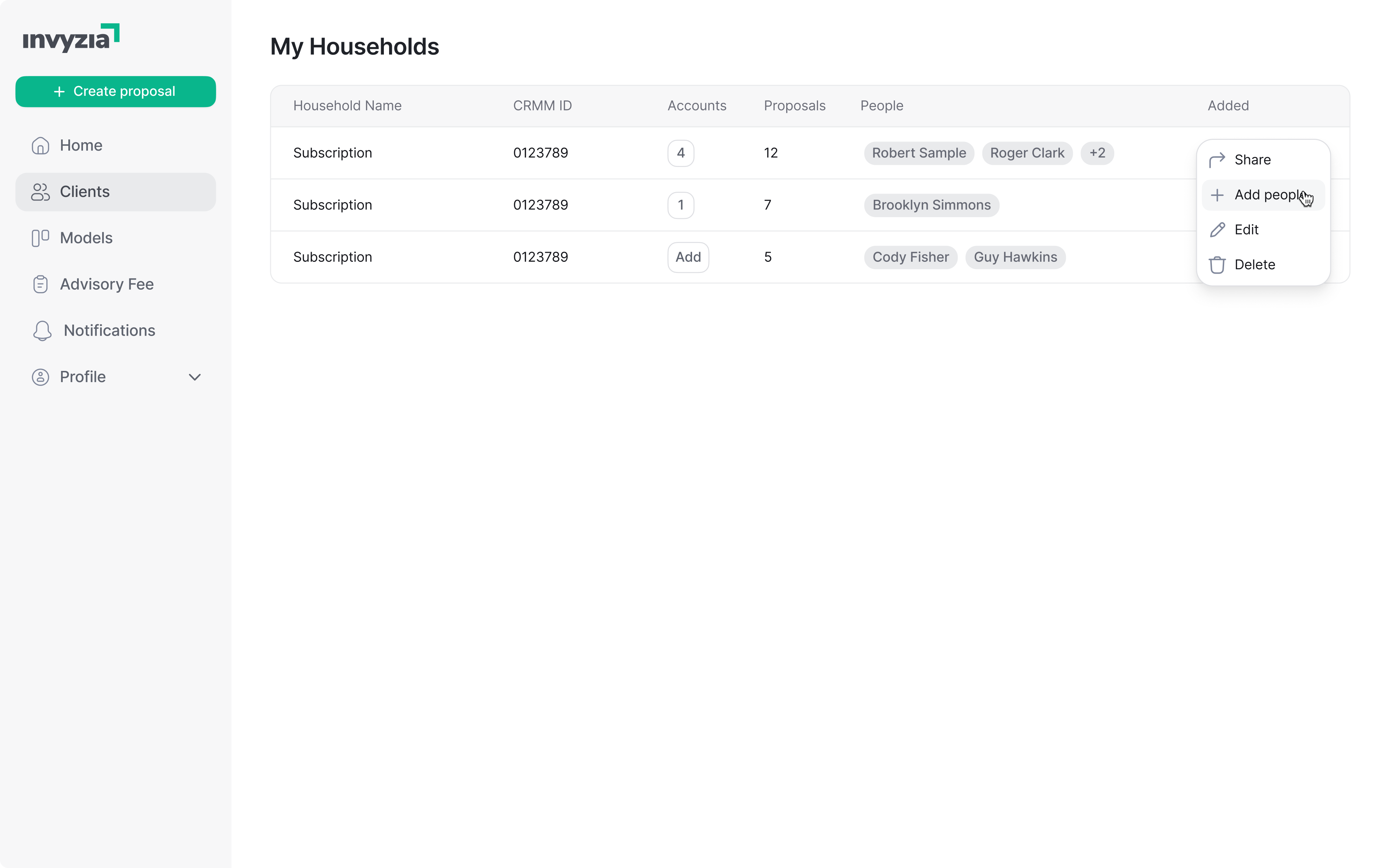 Using a convenient table, advisors can view all households they work with, including their CRM ID, accounts, number of proposals, and people involved in the subscription. It is possible to share, update, and delete subscriptions, as well as add new people.