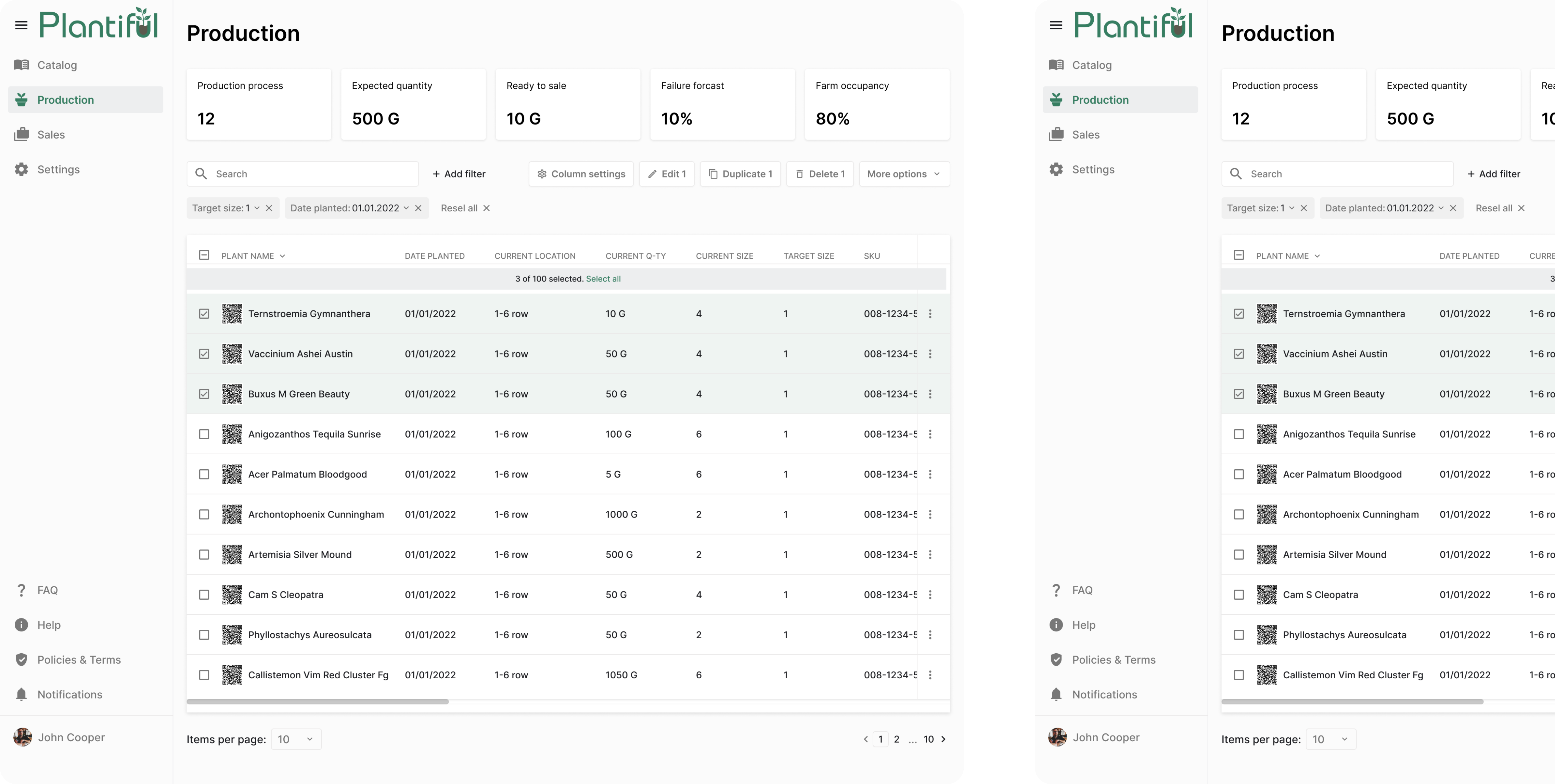 The Production page contains all the necessary information on each plant, including its name, alternative name, current quantity, size, and location, target size, and shipping date and quantity.
