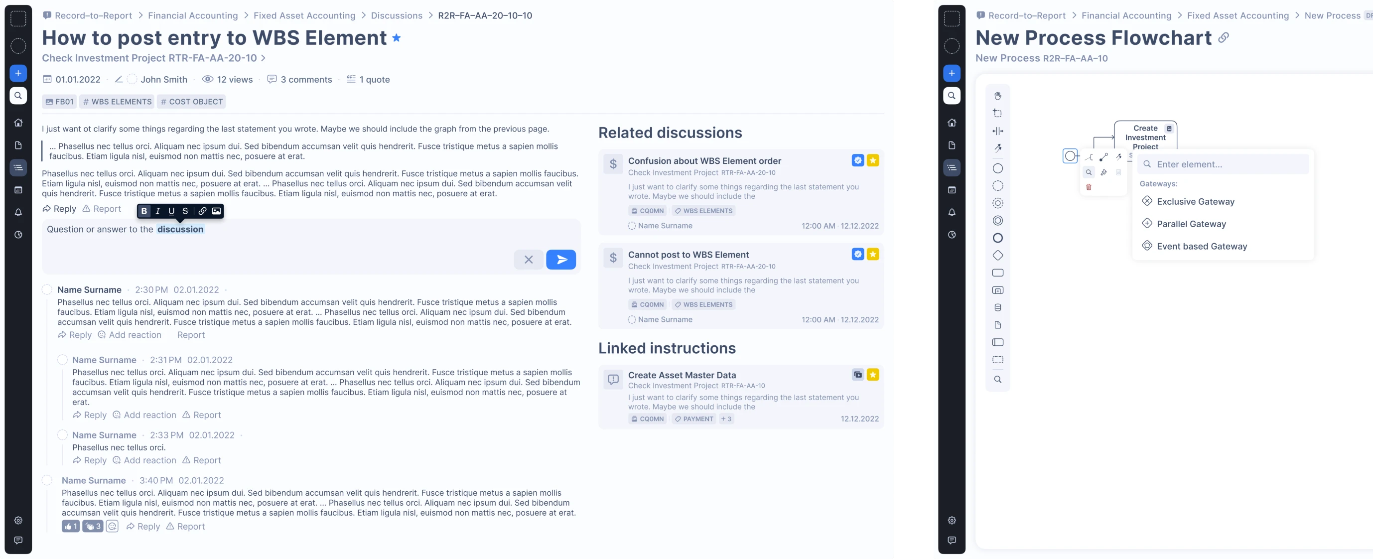As everything is stored in one place, users can insert the necessary data from other processes, as well as draft, store, and share process instructions matching these flowcharts.