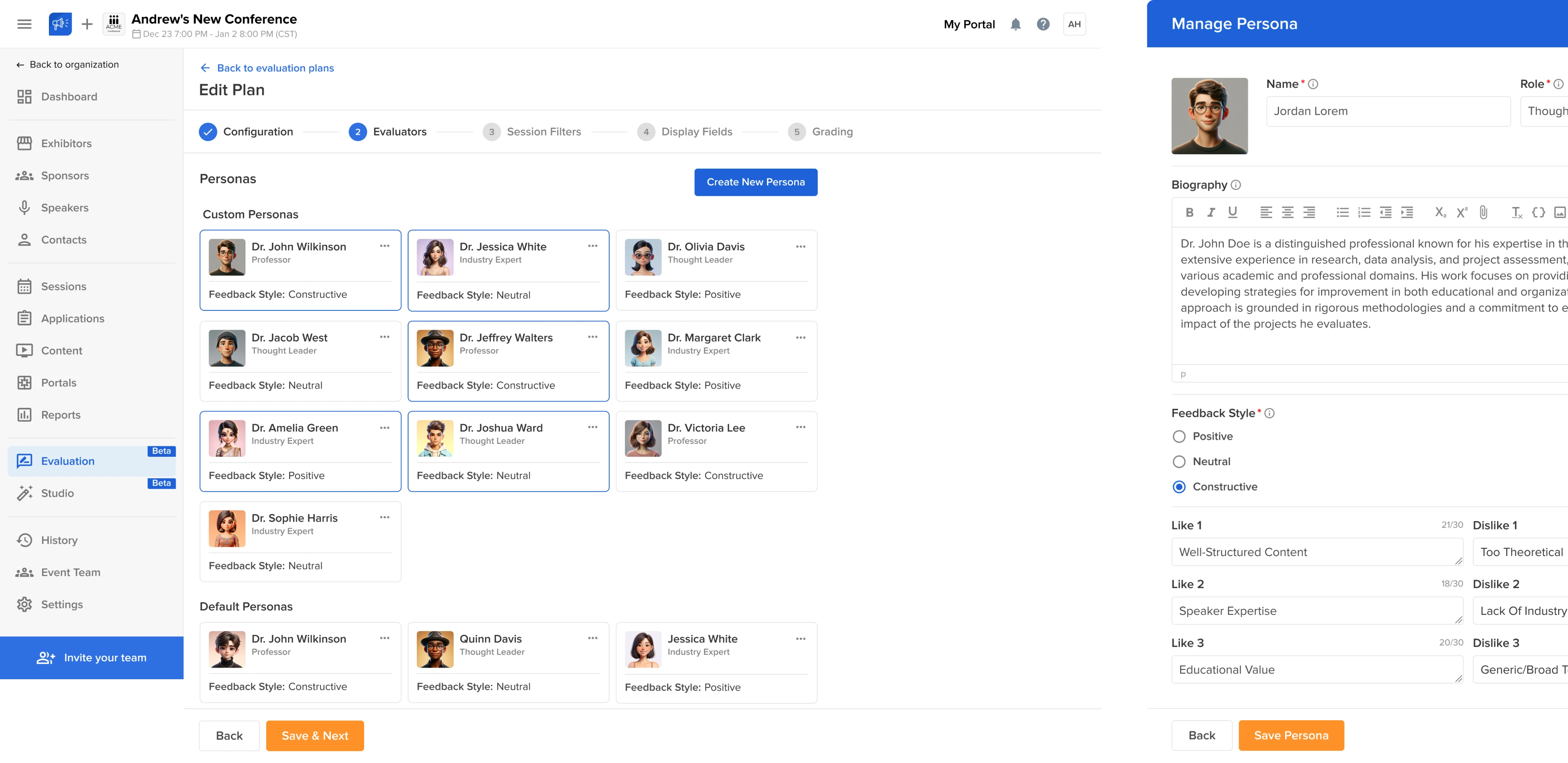 While Studio AI was entirely new, Evaluation AI evolved from Sessionboard’s existing manual review process. Our designer extended the evaluation flow by adding a selector that let users choose between human or AI reviewers.