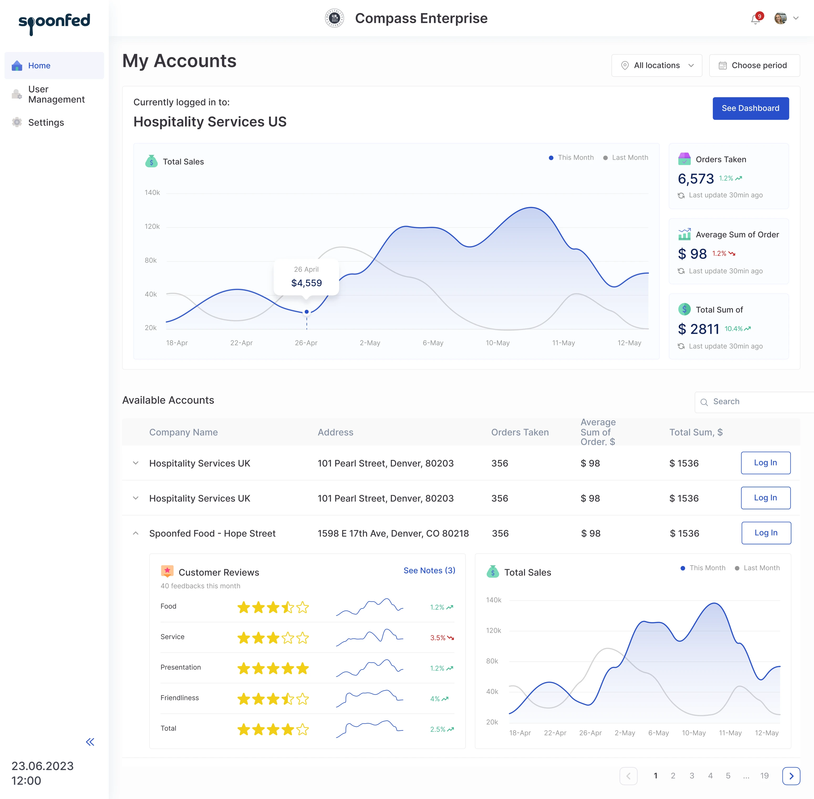 The dashboard in the restaurant management system is customized to fit the needs of different users. For instance, when the accountant enters the system, they see the data about income and expenses, and when the chef enters, they see the orders statistics and providers' information.