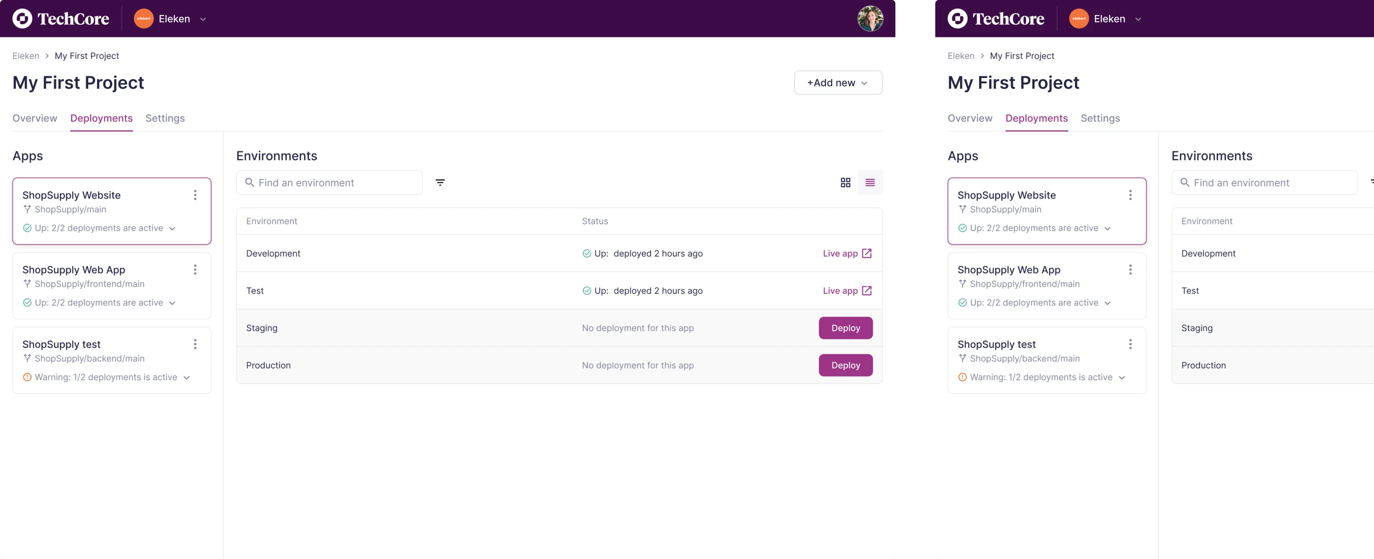 While the design is very minimalistic, dividing the projects into different blocks with borders allows to differentiate them visually at first glance. Using both icons and labels for "apps" and "environments" also allows to present vital information in an approachable way.