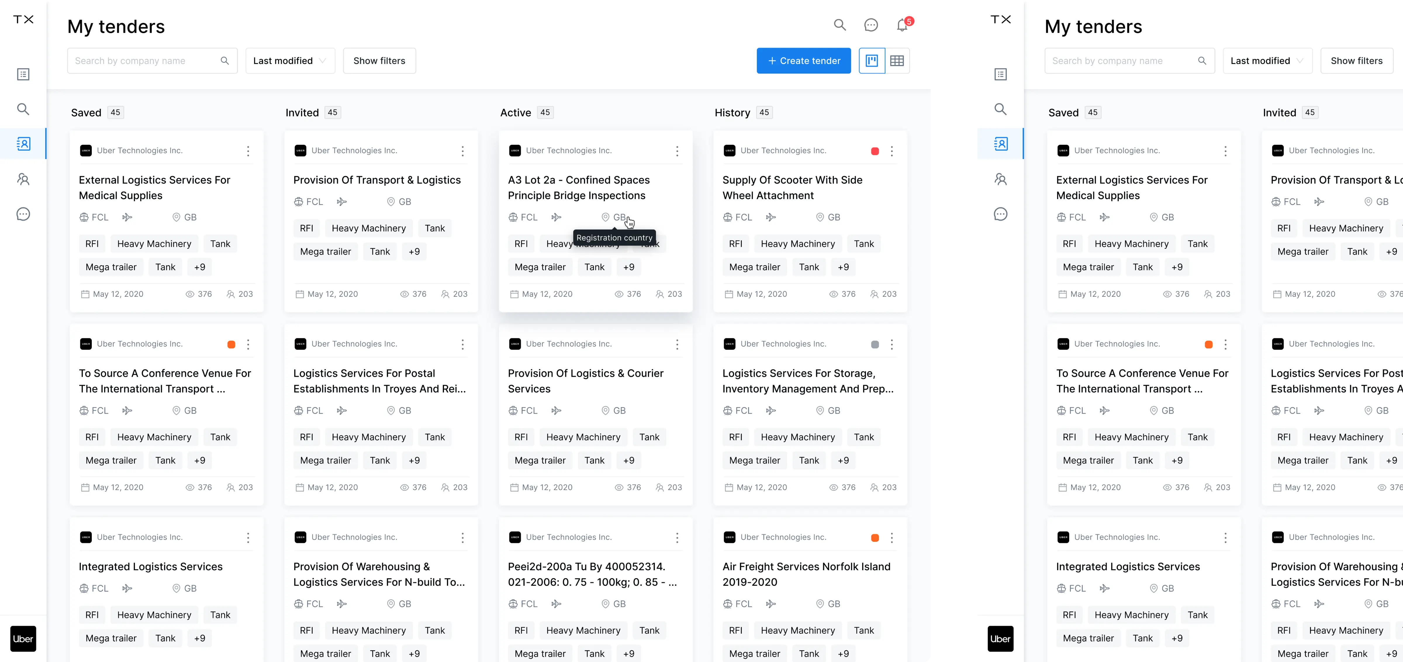 By clicking on the tab My Tenders on the left, shippers can see all the tenders they created including drafts, active tenders, completed tenders, and entire tender history that also lists tenders that were canceled. We created two types of views here: column view and list view. The cards display all the information available at a glance including the number of tender views and participants.