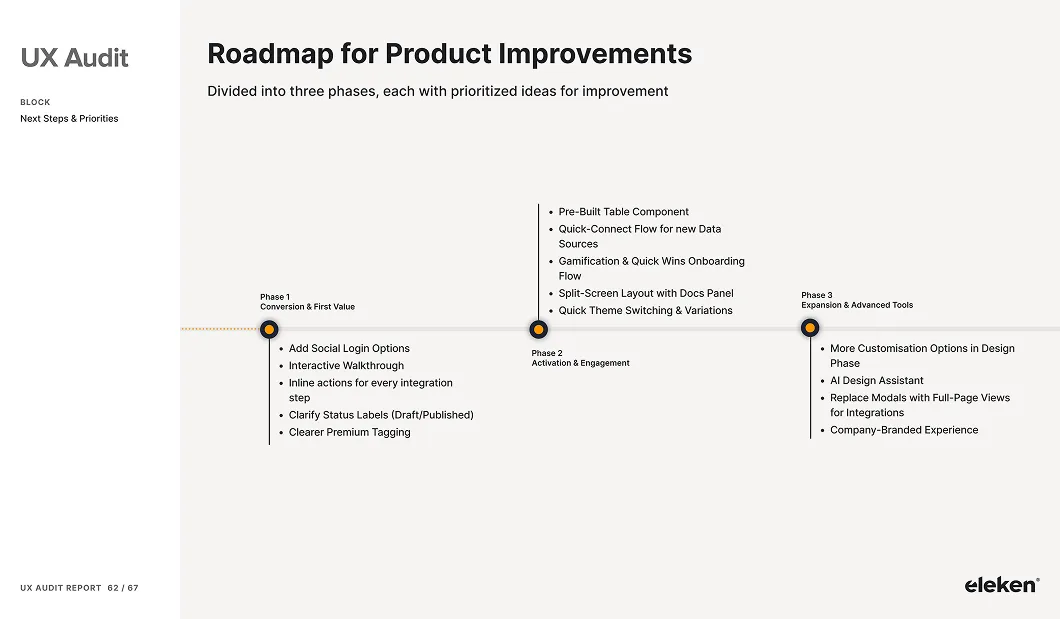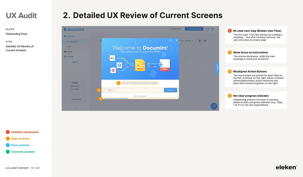The UX audit report serves as your main deliverable — a structured document that translates findings into a clear, actionable improvement plan. Instead of vague recommendations, you get a visual breakdown of issues across your product, each clearly explained and prioritized by impact.